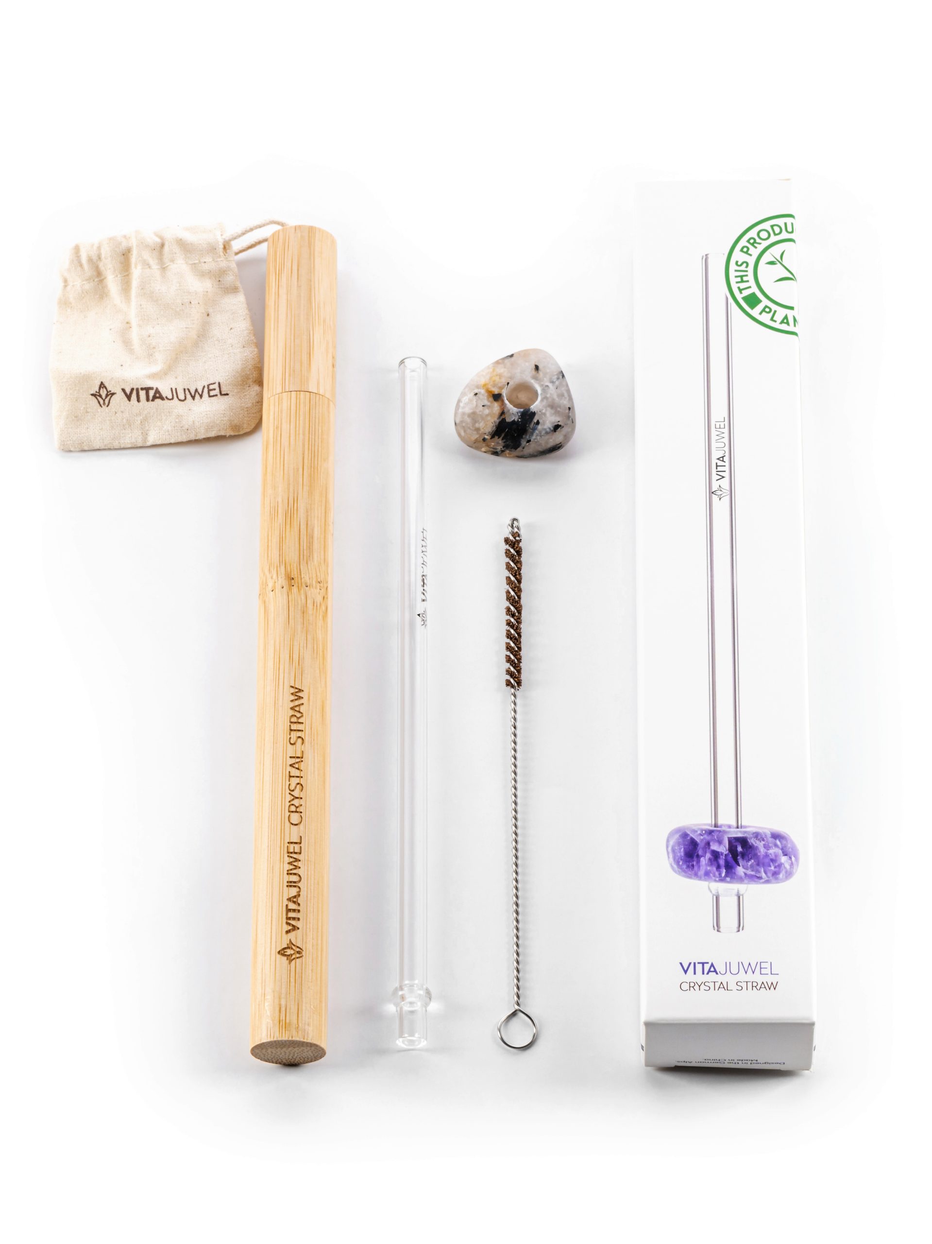 | Lieferumfang | Glastrinkhalm, Edelstein, Reinigungsbürste, Baumwollsäckchen, Bambus Etui |